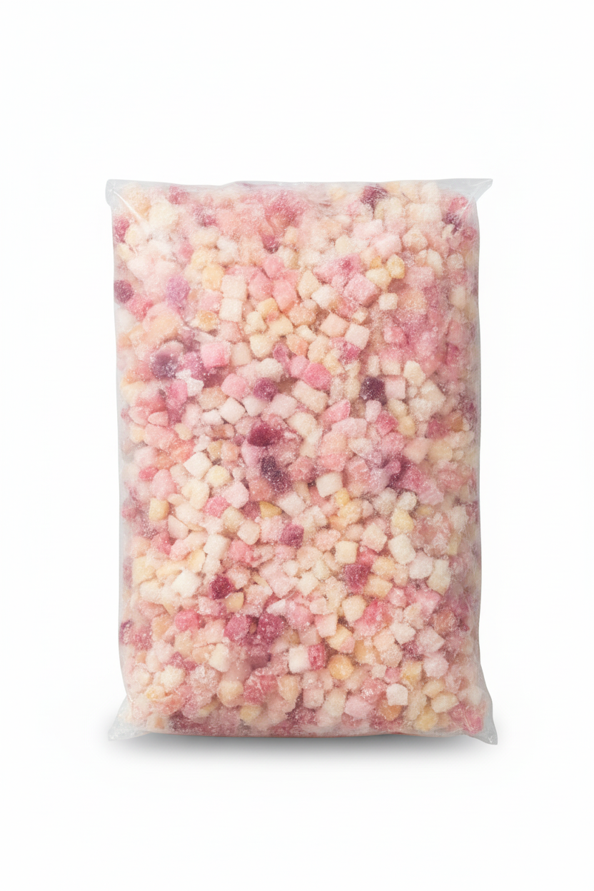 選用新鮮粉紅水蜜桃,切製成標準 1cm 大小的方丁,方便料理與調配,大小一致更適合飲品、甜點與各式料理應用。